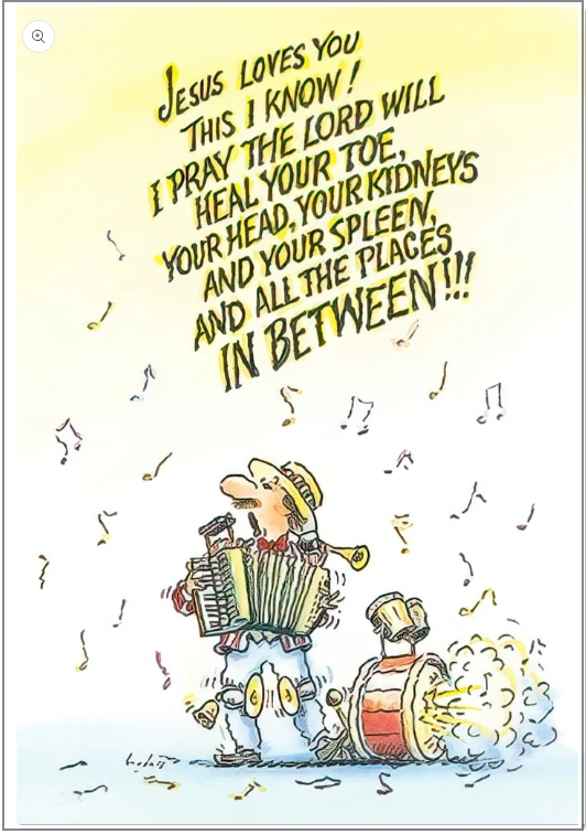 Front: JESUS LOVES YOU THIS I KNOW! I PRAY THE LORD WILL HEAL YOUR TOE, YOUR HEAD, YOUR KIDNEYS AND YOUR SPLEEN, AND ALL THE PLACES IN BETWEEN!!!