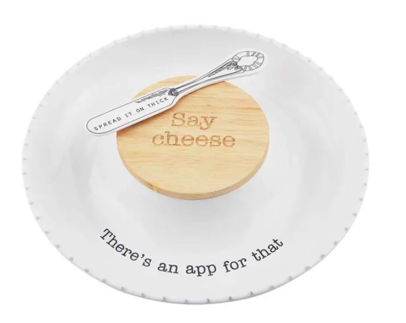 Hungry? There's an app for that, and our Outdoor Chip and Dip Set. The two piece set comes with a beaded melamine chip server. The server features an integral center dip bowl with engraved removable lid. The server reads "There's an app for that". The server comes with a melamine spreader.