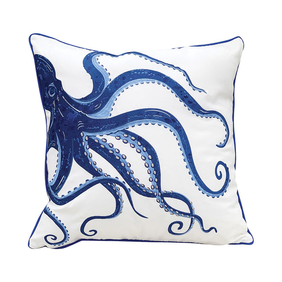 A super smart Cephalopod is heavily embroidered in shades of deep blue on Olefin outdoor canvas. This beautifully embroidered pillow is fade, and abrasion resistant with hidden zipper at bottom and beige back panel.