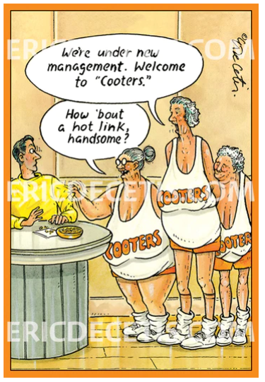 Outside Text: We're under new management. Welcome to "cooters". How 'bout a hot link handsome?