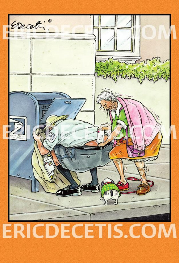 Funny Birthday Card from Eric Decetis. Old Lady posting in postman's butt crack.