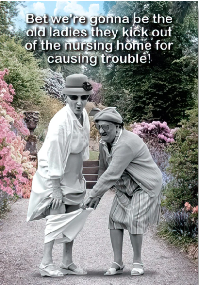 Front: Bet we’re gonna bethe old ladies they kick out of the nursing home for causing trouble!