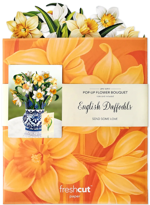 A pop up bouquet of FreshCut Paper Daffodils is a delightful greeting card celebration of uplifting emotions and support. Daffodils are a hardy springtime flower that traditionally symbolize resilience and success. The bright blossoms of this arrangement will outlast normal cut flowers and continue to thrive without any need for water or preservatives. Easy to care for and long-lasting, these flowers will continue to cheer on your special someone for many years to come.