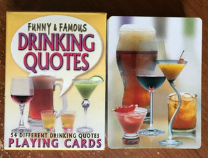 This Drinking Quotes deck contains 52 cards plus 2 jokers. The card backs feature a an image of various cocktail glasses. The 52 playing cards plus jokers all have different quotes on the card faces, as well as the sources. From Winston Churchill to Ann Landers to Plato - this deck covers the entire spectrum.