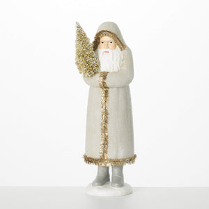 These elegant Santa figurines are dressed for the winter weather and ready to deliver gifts this Christmas season. Each figure is adorned with a silky velvet cloak and is holiday a beautifully deocrated golden bottle brush tree.