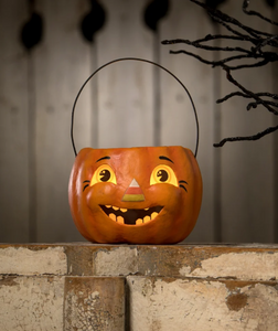 Making your guests happy is exactly what this vintage inspired petite candy corn pumpkin bucket will do! This paper mache bucket with velum inserts will create a glow to any Halloween party. Light not included.