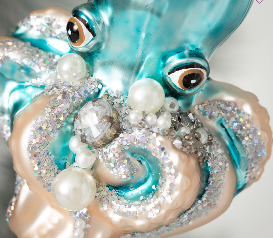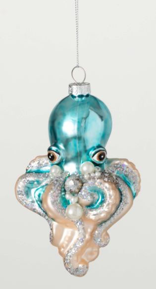 This shiny octopus brings the beach home for the holidays. Its pearly body gleams with iridescent hues that shimmer and shift in the light, encrusted with smooth pearls and shiny glitter. Its festive details capture the spirit of a shoreline Christmas-the joy of a walk on the beach, the laughter of loved ones and the simple pleasures of the season. Add this sparkly, shimmering octopus to your tree to conjure the coastal calm and beauty of the ocean during the hustle and bustle of the holidays.