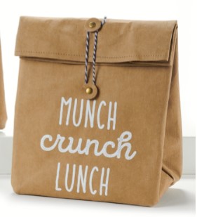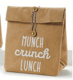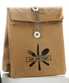 Ethically-made and environmentally-friendly, these lunch bags made with sustainable paper fabric and a string closure are always a good choice to carry a meal or snack. Made from durable material, they are insulated, tear-proof, leak-resistant and splash-proof. 3 Assorted Sentiments: MUNCH, CRUNCH LUNCH. LUNCH IS IN THE BAG. LIVE LOVE FEAST. Hand Wash Recommended, Air Dry. Kraft Paper, PE Foam.