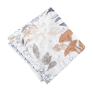 Featuring a watercolor-inspired design of leaves and floral cuttings in complimentary shades of blue and ochre, the Lina tabletop collection will take a neutral tablescape to the next level.
