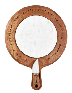 3-piece set. Mango wood paddle board with removable marble inset features magnetic handle to hold included cheese knife in place.