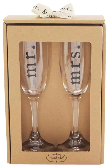 Toast to today, tomorrow, and always with our Mr. & Mrs. Champagne Flute Set. The two piece set comes with two glass champagne flutes. The champagne flutes read "Mr." and "Mrs.". The champagne glass set comes in a box, making it any for gifting to a future "Mr." and "Mrs.".