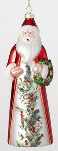 This vintage-inspired Santa ornament brings timeless holiday charm to your decor. Crafted from iridescent material that catches the light, Santa's cloak shimmers with hints of red, green, and gold. Intricate holly embroidery adorns his suit, adding a touch of rustic character.