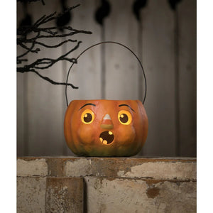 Don't be surprised by how adorable this vintage inspired petite candy corn pumpkin bucket is! This paper mache bucket with velum inserts will create a glow to any Halloween party.