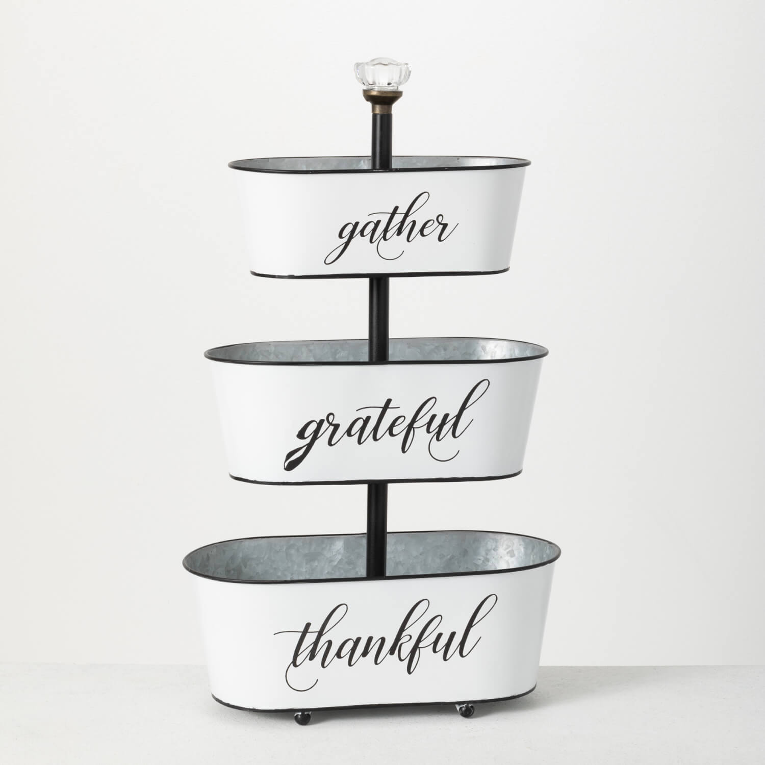 With "gather", "grateful", and "thankful" text imprinted on the front side, these storage planters are black and white and loved all over. Utilize for storage, place in your favorite fruits, or use them as a catch-all for tabletop clutter.