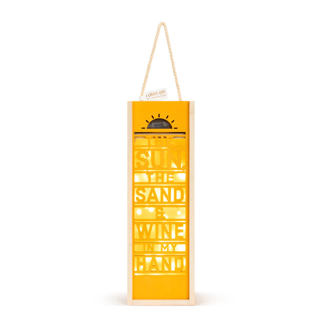 This wine bag doubles as a decorative piece so its playfulness can always be displayed. Wooden and carved with the message, "The sun, the sand & wine in my hand," this lantern will suit the tastes and decorating schemes of any wine lover.