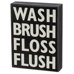 A classic black and white wooden box sign featuring a distressed "Wash - Brush - Floss - Flush" sentiment. Easy to hang or can free-stand alone.
