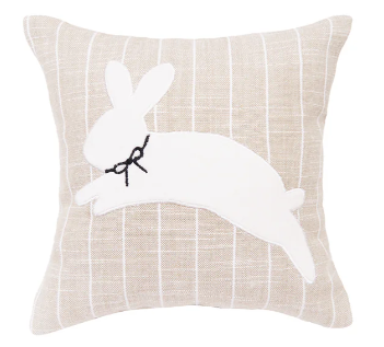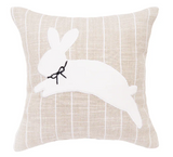 Featuring a neutral background with delicate white stripes, this applique pillow is adorned with a charming white leaping rabbit, complete with a delicate bow around its neck.