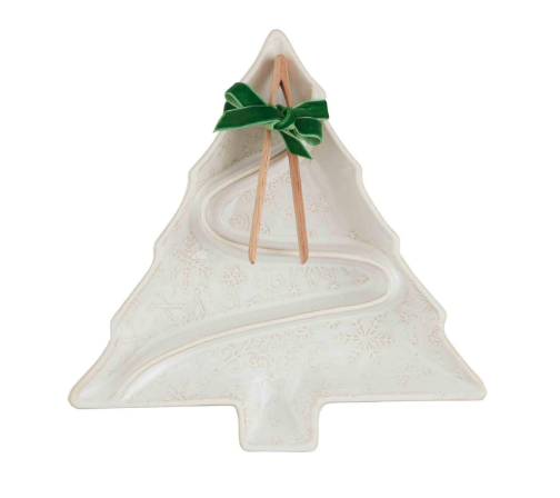 Make this holiday season unforgettable with our White Christmas Tree Divided Server - the ideal combination of functionality, style, and Christmas spirit. This exquisitely crafted serving piece is designed to elevate your holiday entertaining experience. Made from durable stoneware with a charming milk glazed finish, our Christmas tree server is not only visually appealing but also built to last. The server's four-sectioned design allows you to elegantly present an assortment of snacks, candies, or appetizers, making it a versatile addition to your table decor. To add a touch of rustic charm, we've included wooden tongs that perfectly complement the server. Worried about post-celebration clean-up? Don't be! Our ceramic server is dishwasher safe, making maintenance a breeze. Measuring 10" x 10", it provides ample space for your culinary delights, while the 4 1/4" tongs offer easy handling and serving.